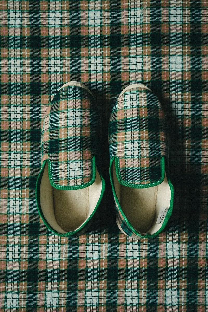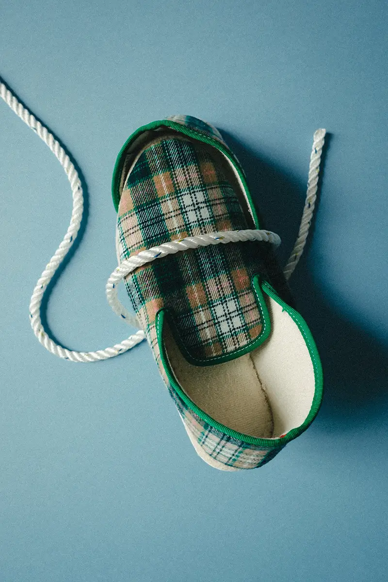 La charentaise d’été vert Morisson s’inscrit dans la plus pure tradition de la charentaise à carreaux, revisitée pour la saison. Son motif à carreaux verts, souligné par un liseré vert vif et lumineux, lui confère une allure à la fois authentique et contemporaine.