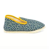 Une Charentaise fleurie de pâquerettes sur un fond bleu marine. Un chausson motif fantaisie avec un intérieur léger en éponge très confort et une semelle en feutre épais. Elle est fabriquée en France à la main
